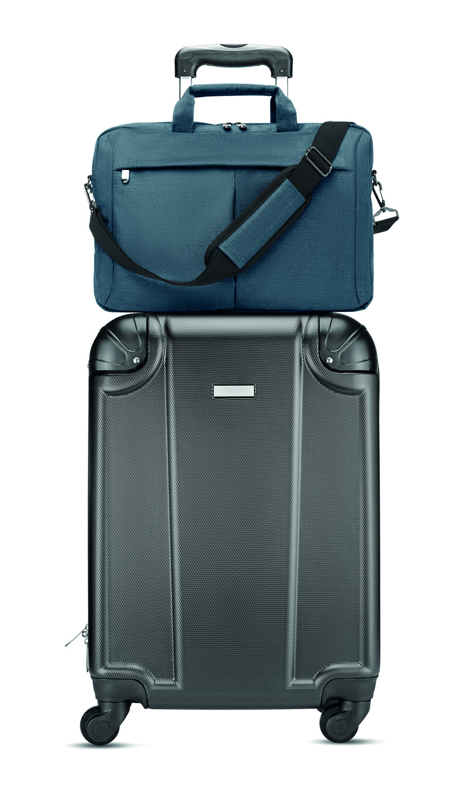 Laptop bag in 360D 2 tone polyester including one main internal compartment for 15 inch laptop and one zippered front pocket. Includes detachable and adjustable shoulder strap. Trolley holder on back side.