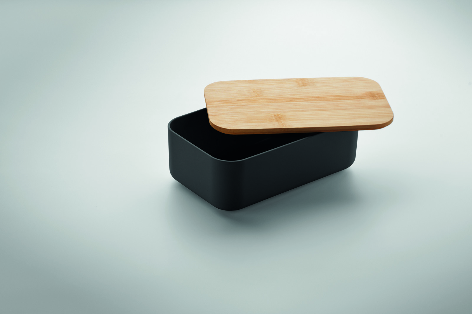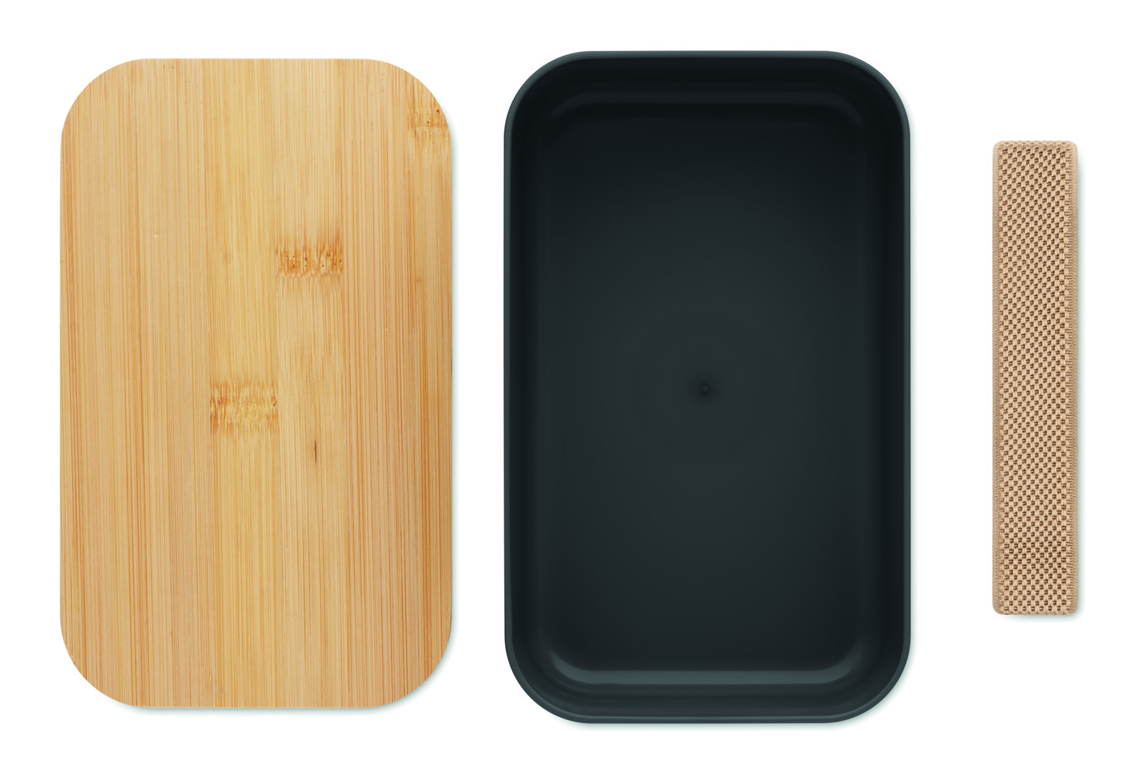 Boîte à lunch en maïs 100% PLA avec couvercle en bambou et fermeture élastique en RPET. Capacité : 1000 ml.