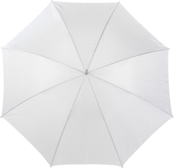 Parapluie grand en polyester 190T, mât et double baleinage en métal et manche en bois.