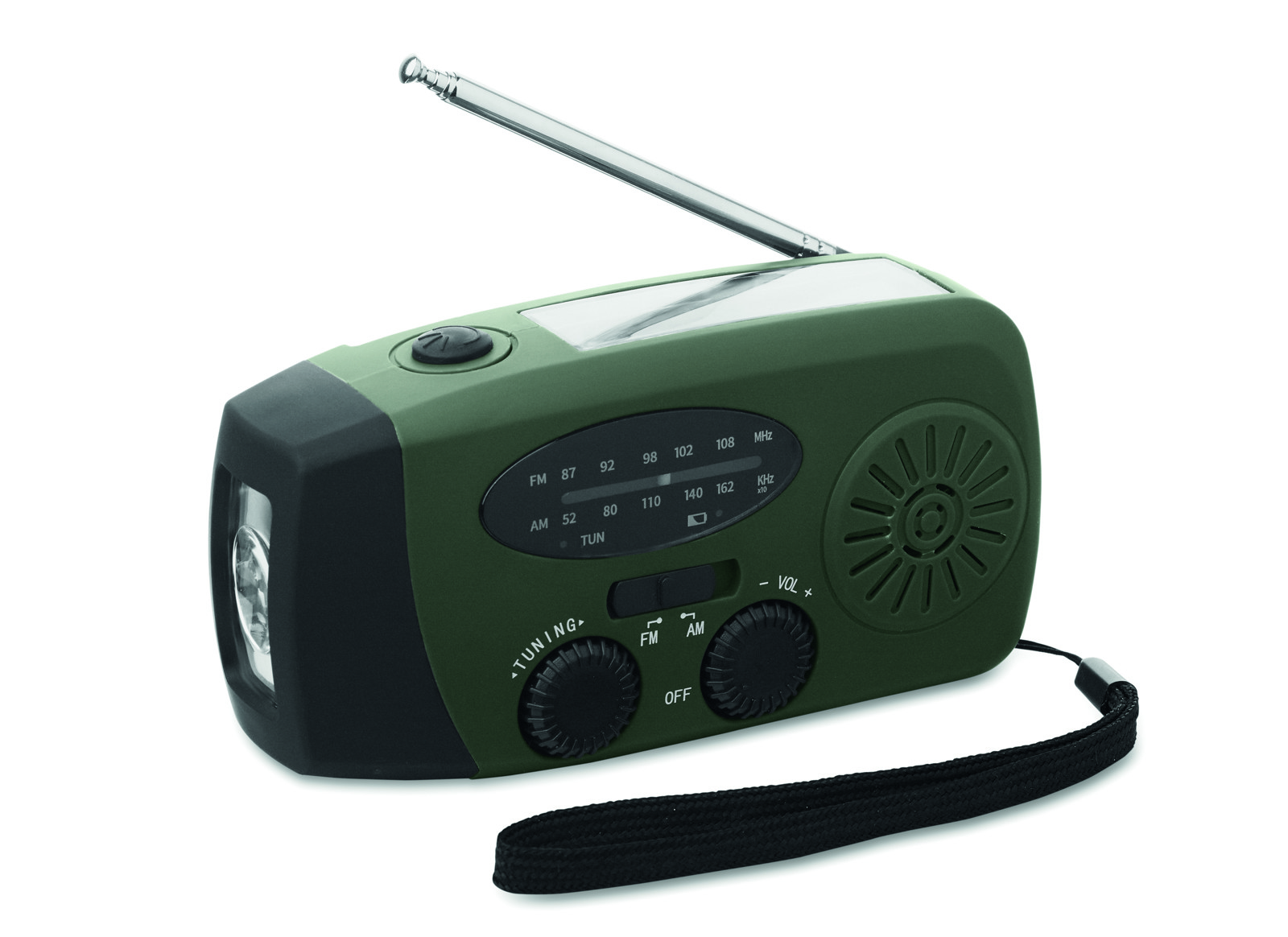 Radio AM/FM portable en ABS avec torche LED (2 réglages) et un Powerbank 1200mAh pour la recharge d'urgence. Alimentée par énergie solaire et par manivelle.