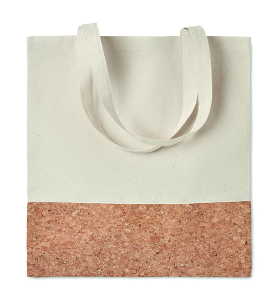 Katoenen boodschappentas met kurkdetail aan de onderzijde en lange hengsels. 160 g/m². Kurk is een natuurlijk materiaal. Door de structurele aard en de porositeit van het materiaal kan het uiteindelijke drukresultaat per item afwijkingen vertonen.