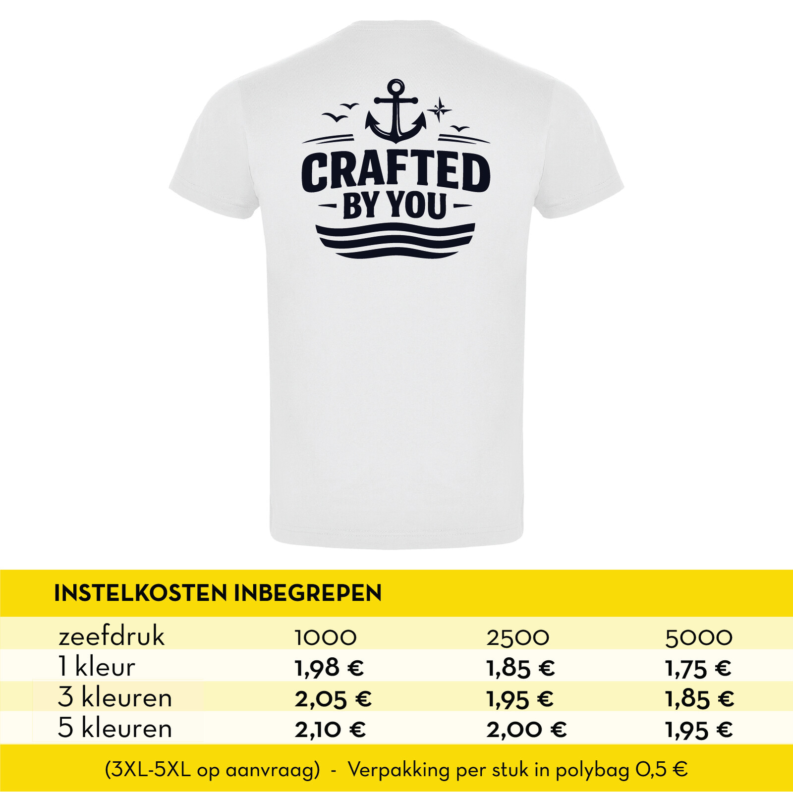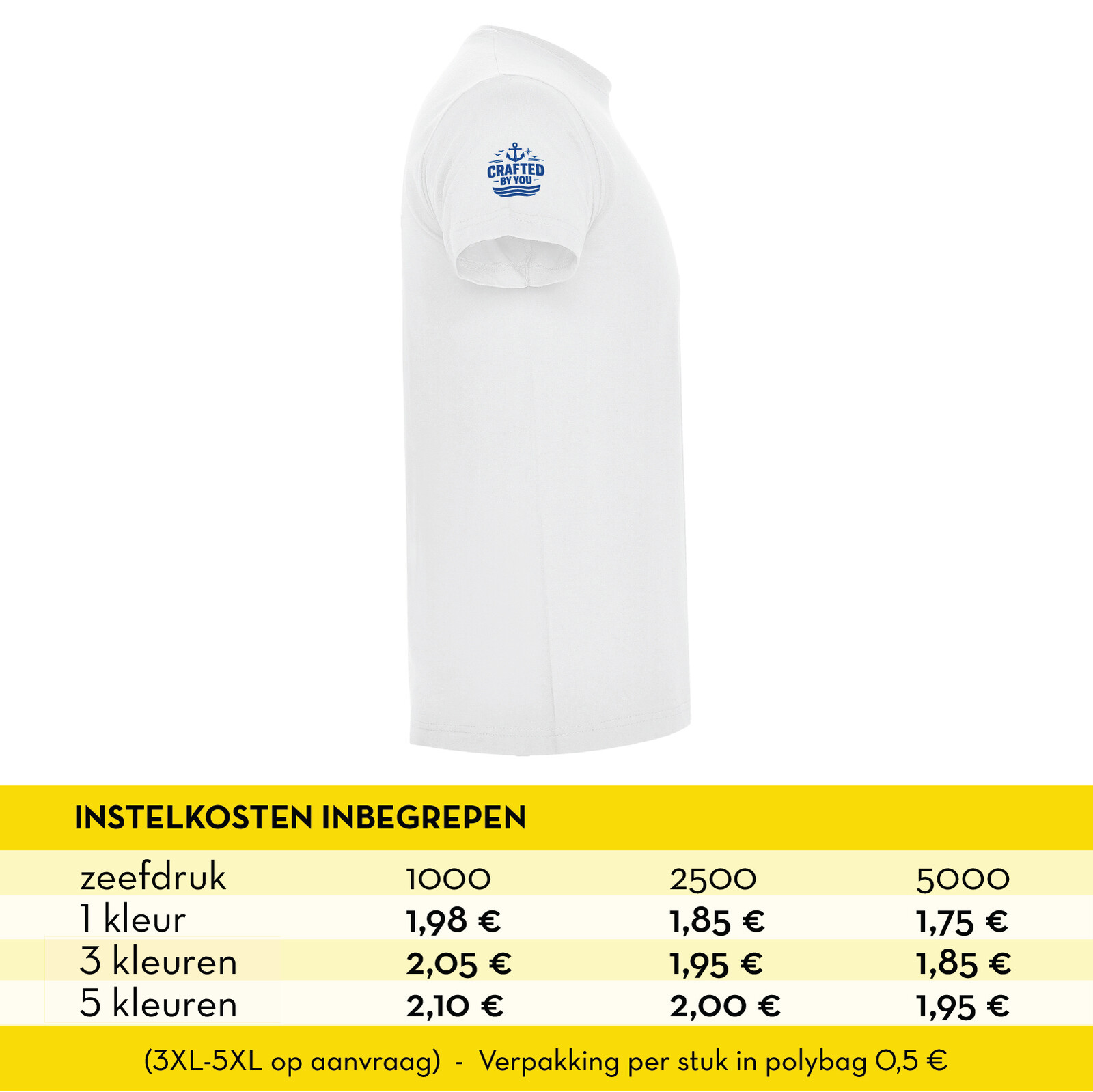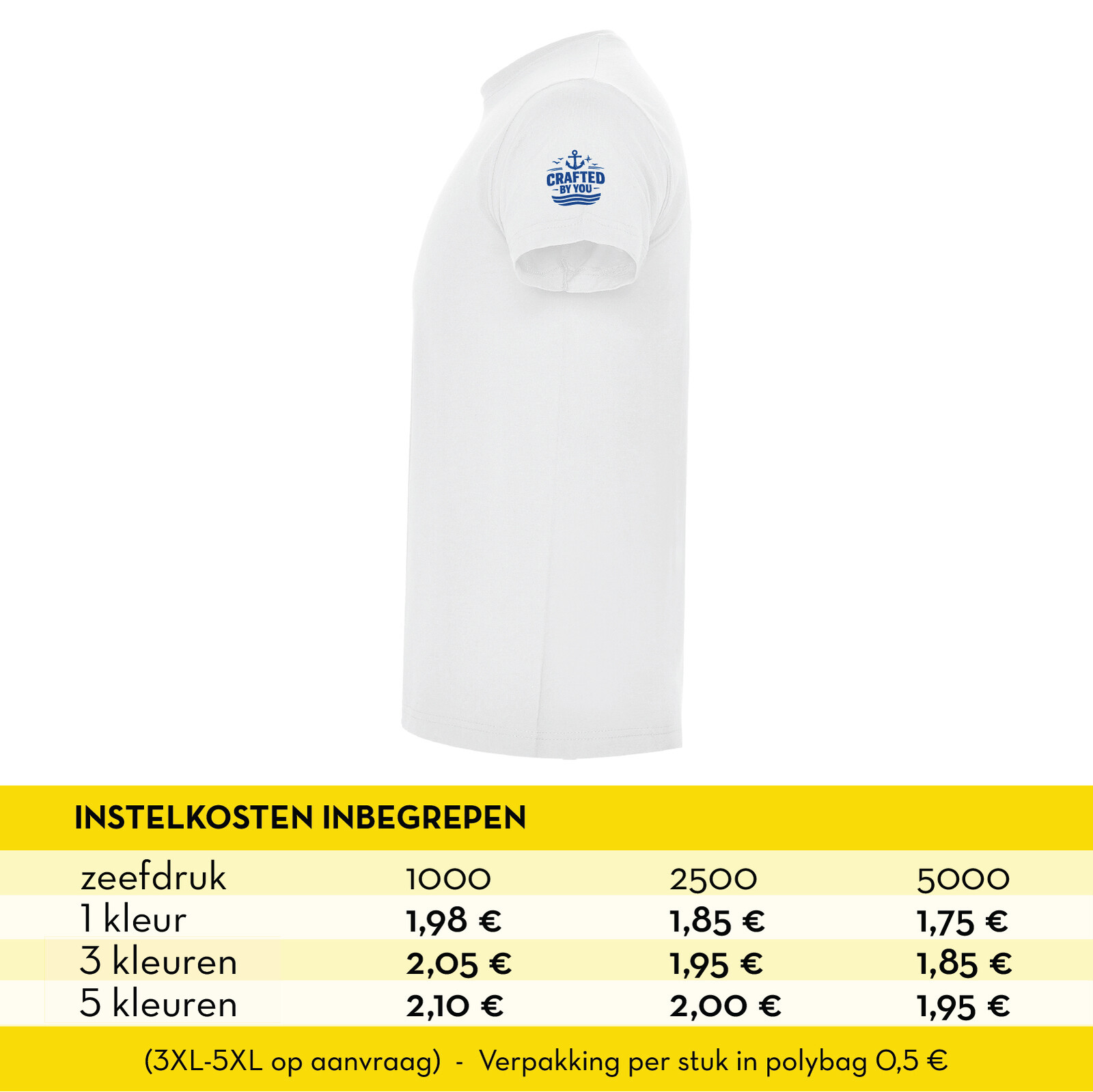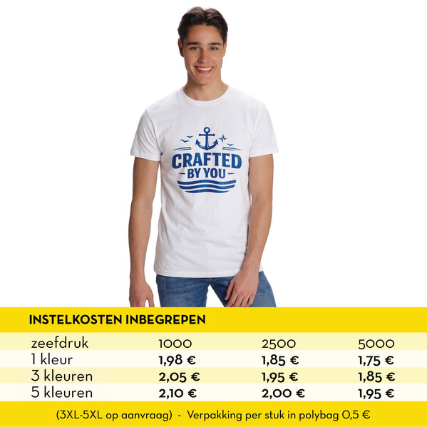 • T-shirt wit - 150 gr. - 100 % katoen - korte mouw • XS - 2XL • Instelkosten inbegrepen • Verpakking per stuk in polybag 0,5 €