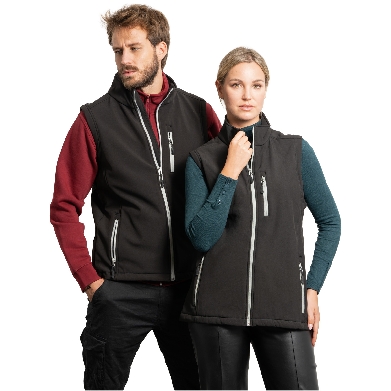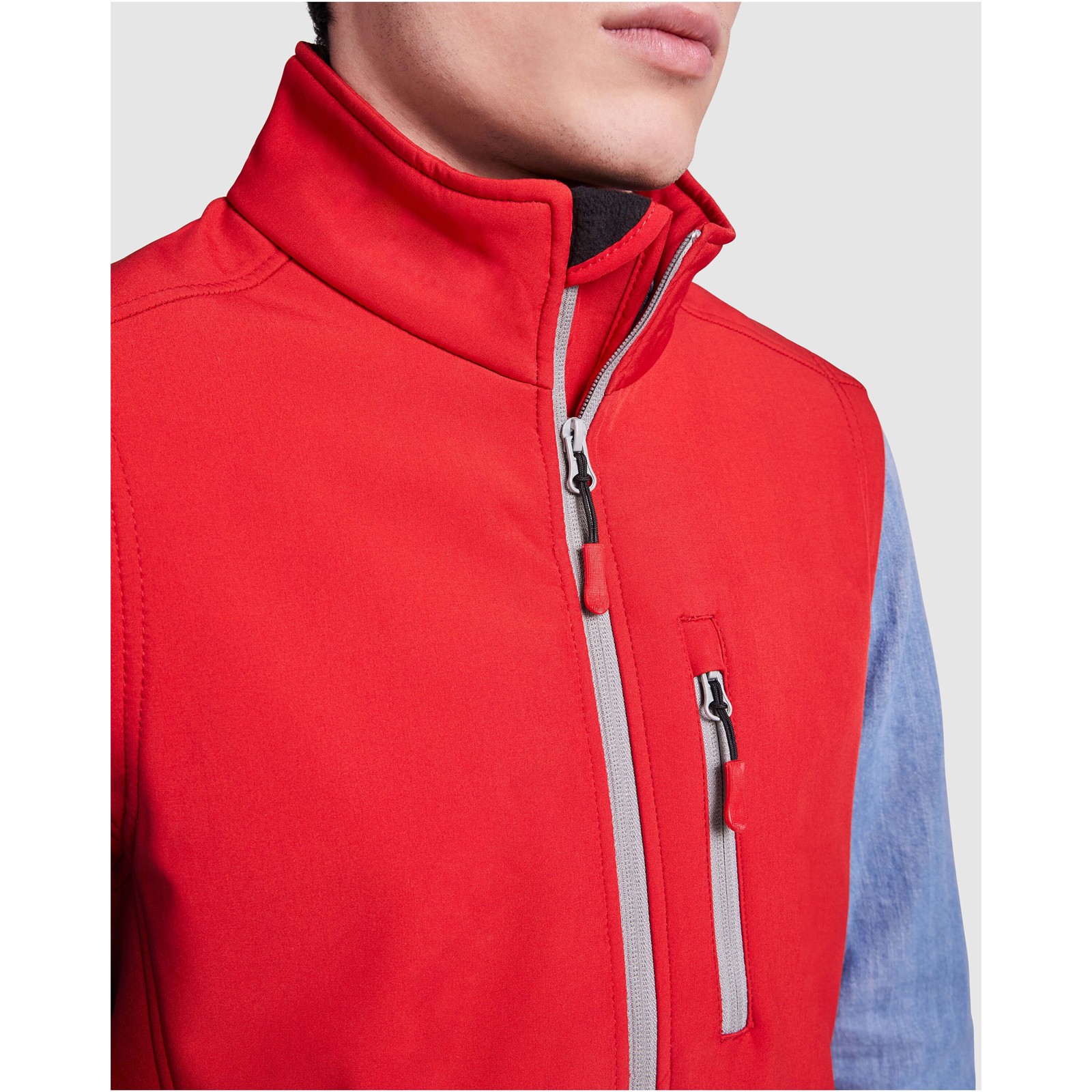 Tweelaags softshellgillet. Contrasterende omgekeerde rits met verzegeld effect, kinbeschermer en trekker. Drie zakken met gecombineerde rits met trekker. Elastisch trekkoord en sluitingen aan de onderkant. Waterafstotend. Winddicht model. Het model is 184 cm en draagt maat L.